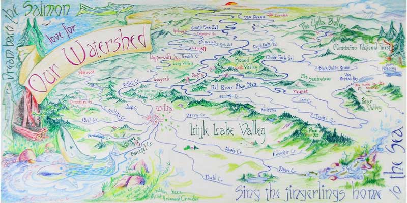 Most of our Zip Code is in the Outlet Creek Watershed, which flows into the Eel River. The southern end of our Zip Code, south of Black Bart Rock, is in the Russian River Watershed. The western most strip of our Zip Code touches on several watersheds such as that of the Noyo River and of Big River. A few years ago, the California Department of Fish and Wildlife completed a draft study of the Outlet Creek Watershed which is available here.